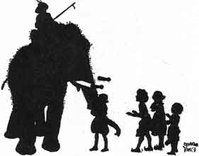 When the work was done at night the young Elephant went to play in the river. The carpenters' children played with him, in the water and on the bank. He liked to pick them up in his trunk and set them on the high branches of the trees and then let them climb down on his back.
