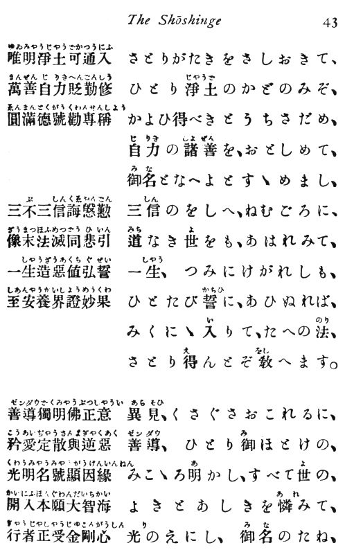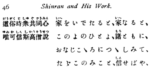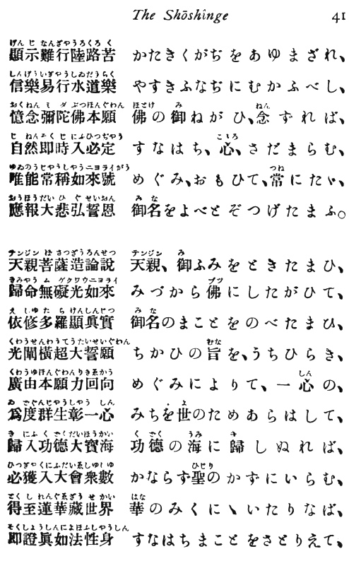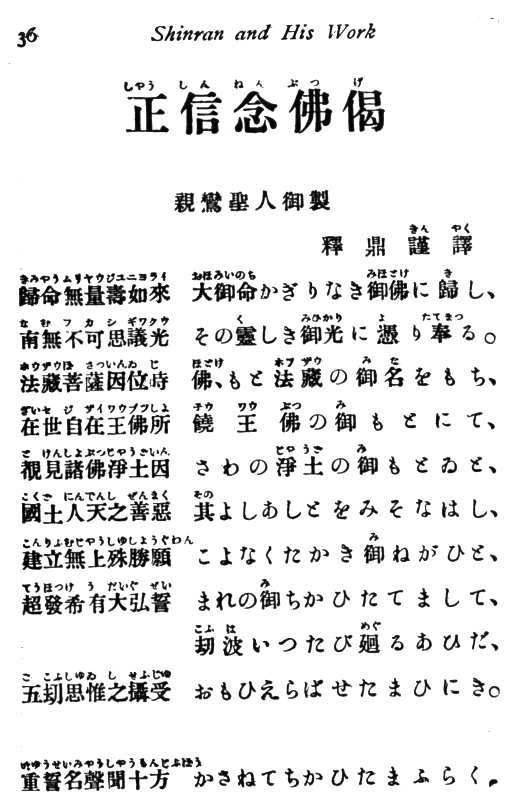 Before proceeding with the treatment of my subject it will be well for me to put my readers in possession of this celebrated poem * or hymn, composed by the great Shinran himself, which is said to form a part of the daily devotions of every truly devout Shinshu household. I shall constantly have occasion to refer to it in the course of these pages, as it forms in itself a sort of summary of the whole historical position of the Shinshu. I am fortunately able to avail myself of the assistance afforded me by a translation from Mr. Tada's own pen. I have in several passages made use of words and phrases drawn from Christian theology to express what I have believed to be the real meaning of the poem. I have done so purposely, my object in doing so being to call attention to the parallelisms between the two systems. They are indeed well called parallel, for like parallel straight lines they "meet in Infinity." May we say that Infinity is God?