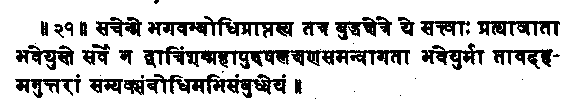 21. 'When I have obtained Buddhahood, if gods and men in my country should not all be endowed perfectly with the thirty-two marks of the great man, may I not obtain the perfect knowledge.'
