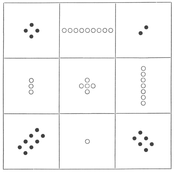 Put in the fewest words, these Diagrams are the eight possible combinations or arrangements of a line and a broken line in groups of three, so that either one or the other is repeated twice, and in two cases three times, in the same combination. Thus, there may be a broken line above or below two unbroken lines, two broken lines above or below one unbroken line, a broken line between two unbroken lines, an unbroken line between two broken lines, and finally, a diagram of three unbroken lines, and another of three broken lines. Of these last two, the former, three unbroken lines, was held to represent the sky; the latter, three broken lines, stood for the earth. The remaining six figures were identified as symbols