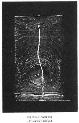The south-pointing needle is an ancient Chinese invention which for some time seems to have been forgotten. Professor Friedrich Hirth of Columbia University has privately communicated to me facts which prove that it was employed in ancient times by travelers through the desert, that the invention was lost and had to be rediscovered. We would add, too, that the Chinese invention became known in Europe after the time of Marco Polo where it was soon used as a mariner's compass. The incident is well known and can easily be established on the testimony of literary sources, but while sauntering through the National Museum at Washington, the writer discovered a palpable evidence in the show cases there exhibited, which displayed the Chinese pocket instruments containing south-pointing needles presumably a few centuries old, side by side with European compasses. They are of the same oblong shape and consist of two tablets hinged in the same manner. The European instruments have sun-dials in addition and are decidedly more serviceable for practical use but we can not doubt that for the original idea our ancestors are indebted to our Mongol fellow-men. *