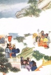He was met by a lady of charming appearance, who came out of an inner room, and said: “Who is this that ventures to intrude upon a widow’s household?” The situation was embarrassing, but the lady proved to be most affable, welcomed them all very heartily, told them how she became a widow and had been left in possession of riches in abundance, and that she had three daughters, Truth, Love, and Pity by name. She then proceeded to make a proposal of marriage, not only on behalf of herself, but of her three daughters as well. They were four men, and here were four women; she had mountain lands for fruit-trees, dry lands for grain, flooded fields for rice—more than five thousand acres of each; horses, oxen, sheep, pigs innumerable; sixty or seventy farmsteads; granaries choked with grain; storehouses full p. 343 of silks and satins; gold and silver enough to last several lifetimes however extravagantly they lived. Why should the four travellers not finish their journey there, and be happy ever afterward? The temptation was great, especially as the three daughters were ladies of surpassing beauty as well as adepts at needlework and embroidery, well read, and able to sing sweetly.