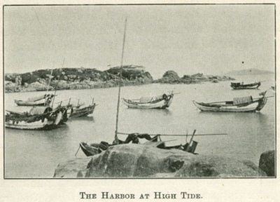 Following the path that leads eastward along the shore until the northeastern point is reached, a place of unusual interest is seen, called the Fan Yin Tung (Buddhist Echo Cave). In an almost perpendicular rock, over one hundred feet high, is a wide cleft extending back into the rock so far that the end can not be seen from the temple bridge built across the chasm about midway. When the waves dash. against the rocks at the bottom of this cliff, and the sun shines upon the spray and mist rising up into the clefted rock, a natural phenomenon appears, the colors similar to those produced by the sun's rays falling upon raindrops are seen. The devout Buddhists firmly believe that this natural appearance is a living Buddha. A priest said to us, "Only believers can see him." When visiting this place, two elderly women were worshiping upon this temple bridge. After making their prostrations facing the cleft, the old Taoist recluse in charge of this shrine directed their attention to the place where the Buddha would appear. They looked, and they looked, until nature was in their favor, and the sun broke through the clouds, and they saw their heart's desire—the Living Buddha —a fraction of the rainbow.
