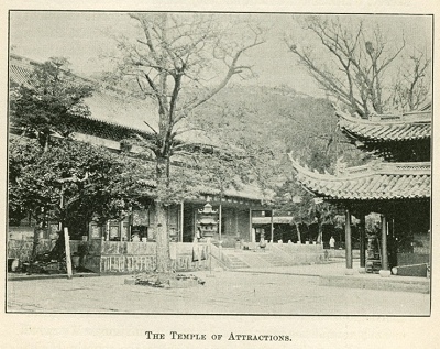 On approaching the island the visitor is landed at the southern point upon a well-built stone jetty, from which a broad, well-paved road leads to the three main temples. The front is called Universal Salvation Temple. The rear is called Rain-Producing Temple, and there is another called Wisdom's Salvation Temple. Smaller roads branch off in all directions, leading to grottoes, temples, and shrines of all sizes and shapes. As of ancient Judah, it can indeed be said that "in the high places and on the hills and under every green tree" the gods are worshiped, and even in the rocks images are hewn. These walks are lined with large, shady trees, and aromatic shrubs diffuse the air with a pleasant fragrance.