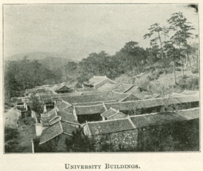 years (A.D. 805–807), a school was opened here, fields bought, buildings erected, and students gathered. The scholarly Si Shan-tao, who had thoroughly mastered the Nine Canonical Books, was chosen from the Imperial Academy of Learning to be the president of this institution, and it was called the Government School of the Lü Mountains. The institution soon increased in number and influence, and many of the early students became famous in public life. In the year A.D. 960, the institution was raised to the grade of a university, and stood equal in rank and influence with Chi Yong, Shih Ku, and Yo Lao Universities. The attendance of over one hundred students is mentioned at this time.