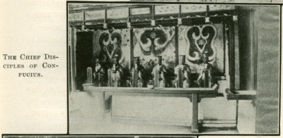 Another evidence that these Confucian scholars are far from being free of the belief in idols and images is clearly seen in the Confucian Temple located in the midst of the college buildings. In the main hall of this building are large images of Confucius, Mencius, and fifteen of the most famous disciples of Confucius. And what is not seen even at a Buddhist temple there are here four gods standing on the top of the roof, two looking northward, and two southward. In the room in front of the grotto is also a large image of Chü Fu-tsz.
