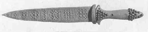 Gold dagger, with a handle of deep blue lapis lazuli studded with gold; the sheath in which it was found is also of gold. (See page 289.)