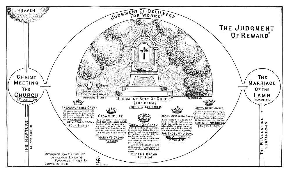 While the "Thrones" were placed (ready for those who should be found worthy to occupy them) they were as yet unoccupied. Their occupancy awaited the outcome of the Judgment. Now as the "Thrones" that John saw were occupied by crowned Elders. Then those Elders must have passed the "fiery test" of the Judgment of Reward (2. Cor. 5:10, 1. Cor. 3:11-15), and received their crowns. Those Crowns are five in number. The "Incorruptible Crown." 1. Cor. 9:25-27. The "Crown of Life." Rev. 2:10. The "Crown of Glory." 1. Pet. 5:2-4. The "Crown of Righteousness." 2. Tim. 4:8. The "Crown of Rejoicing." 1. Thess. 2:19-20. See the Chart--"Judgment of Reward."