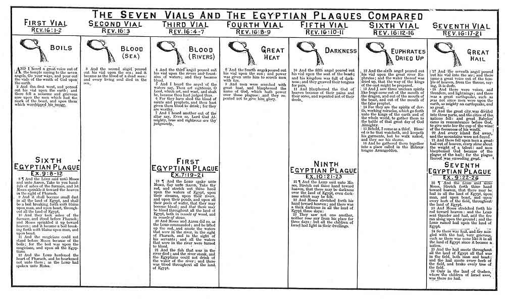 These "VIALS" and their contents are LITERAL. One cannot imagine that such momentous things as are here described refer to historical events that are already past, as when some interpret the "First Vial" as the French Revolution in A. D. 1792, and the "sores" its infidelity; and the "Second Vial" as the naval wars of that Revolution; the "Third Vial" as the battles of Napoleon in Italy, and the rest of the Vials as historical events that happened in the Nineteenth Century. If this be true then we have been passing in the past 125 years through the period of the Great Tribulation without knowing it, and have been preaching "Grace" and not that "THE HOUR OF HIS JUDGMENT IS COME." This is supposition and not EXPOSITION, and requires the reader of the Book of Revelation to be versed in all the historical events of the Christian Era. No, these "Vial Judgments" are yet future, and will be literally fulfilled as here described, and this gives us the "KEY" to the LITERALNESS of the whole Book of Revelation. That these "Vial Judgments" are not figurative is clear from the fact that 4 of the 7 have actually happened before. They are simply repetitions of the "PLAGUES OF EGYPT." See the "Chart on the " and the "Egyptian Plagues" compared. This Plague of a "NOISOME AND GRIEVOUS SORE" that shall fall upon men, is a repetition of the "Plague of Boils" that fell upon the Egyptians at the time of the Exodus. Ex. 9:8-12. The "First Vial Judgment" then will be a repetition of the "Sixth Egyptian Plague." That that Plague actually happened no believer in the Bible doubts, then why should we try to explain away the literalness of the Plagues that shall follow the pouring out of each of these Vials.