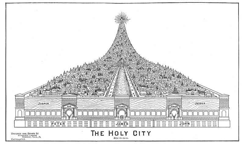 The Pyramidal part of the City will doubtless be in the centre of the City, and probably not occupy over one-half of the surface area, leaving the remainder to be divided up into boulevards and broad avenues, with numerous parks and residential sections. We are told that the City itself is of Pure Gold, Like Unto Clear Glass. Rev. 21:18. If this refers to the houses and homes of the inhabitants, then the redeemed are to live in palaces of Transparent Gold, and the streets are to be of the same material. Rev. 21:18, 21. We cannot imagine a city with such dwellings and streets to be unclean or lack beauty.