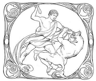 But Theseus stept aside nimbly, and as he passed by, cut him in the knee; and ere he could turn in the narrow path, he followed him, and stabbed him again and again from behind, till the monster fled bellowing wildly; for he had never before felt a wound. And Theseus followed him at full speed, holding the clue of thread in his left hand.