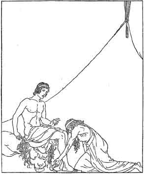 NOW that Hector was dead, King Priam, his father, had only one thought in his mind, and that was to get his body from Achilles and bring it into the City so that it might be treated with the honour befitting the man who had been the guardian of Troy. And while he sat in his grief, thinking of his noble son lying so far from those who would have wept over him, behold! there appeared before him Iris, the messenger of Zeus, the greatest of the Gods. Iris said to him, "King, thou mayst ransom from Achilles the body of Hector, thy noble son. Go thou thyself to the hut of Achilles and bring with thee great gifts to offer him. Take with thee a wagon that thou mayst bring back in it the body, and let only one old henchman go with thee to drive the mules."