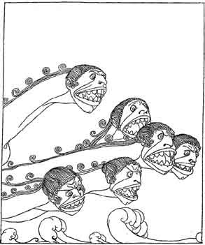 "On the other side of the Rocks Wandering are two peaks through which thou wilt have to take thy ship. One peak is smooth and sheer and goes up to the clouds of heaven. In the middle of it there is a cave, and that cave is the den of a monster named Scylla. This monster has six necks and on each neck there is a hideous head. She holds her heads over the gulf, seeking for prey and yelping horribly. No ship has ever passed that way without Scylla seizing and carrying off in each mouth of her six heads the body of a man."