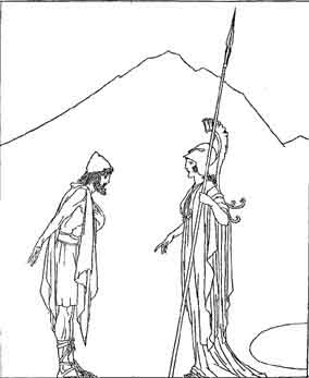 Odysseus awakened on the beach of his own land. A mist lay over all, and he did not know what land he had come to. He thought that the Phæacians had left him forsaken on a strange shore. As he looked around him in his bewilderment he saw one who was like a Kings son approaching.