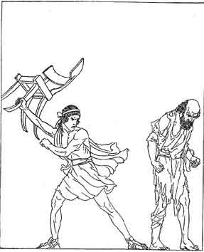 So Odysseus spoke and Antinous became terribly angered. He caught up a footstool, and with it he struck Odysseus in the back, at the base of the right shoulder. Such a blow would have knocked another man over, but Odysseus stood steadfast under it. He gave one look at Antinous, and then without a word he went over and sat down again upon the threshold.
