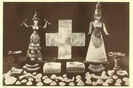 Snake Goddesses, or goddesses and priestess, "fetish cross", shells, libation jugs, stones hollowed for holding offerings, &c.