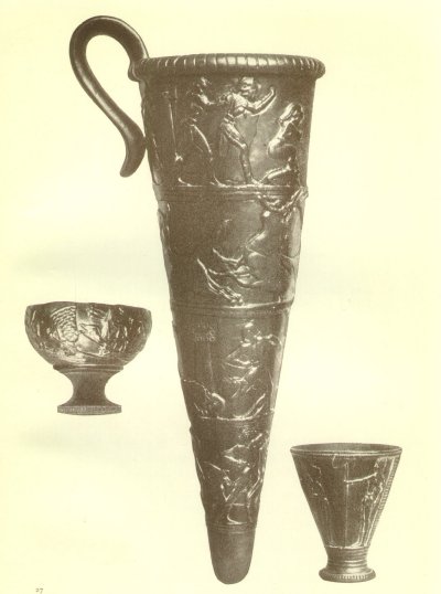 Three stone vases, with figures sculptured in relief, which were found in the villa, are triumphs of Minoan art. On one is a group of warriors with shields, and two outstanding figures, one posed stiffly with outstretched right arm, and grasping a long staff or lance as if issuing a military order, and the other with a drawn sword resting on his right shoulder, standing at attention. The second vase is divided into four zones, in which appear the figures