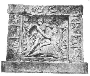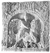 This monument, which escaped mutilation at the hands of the early fanatics, was discovered in 1838 in a cave near Neuenheim, a village on the southern slope of the Heiligenberg, near Heidelberg, by workmen who were laying the foundation of a farmhouse. It is interesting as distinctly showing in a series of small bas-reliefs twelve important scenes from the life of Mithra, including the following: His birth from the rocks (top of left border), his capture of the bull, which he carries to the cave (right hand border), his ascent to Ahura-Mazda (top border). The second scene from the top of the left border is likewise interesting; it represents Kronos (Zervan) handing to Zeus (Ahura-Mazda) the scepter of the government of the world.