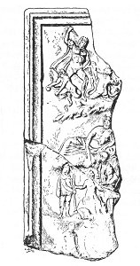 Found at Virunum, in Noricum, and now in the Historical Museum Rudolfinum, Klagenfurt, Austria. The central part of the monument is entirely destroyed; the head of the sun-god from the left-hand corner alone having been left (see Fig. 11), The left border represents a Hellenized illustration of Ahura-Mazda's struggle with demons, after the manner of the gigantomachy. The lower part of the same fragment exhibits the birth of Mithra. (T. et M., p. 336.)