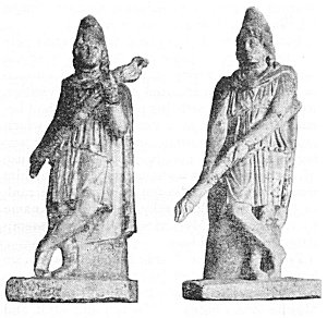 The one to the left has the head of Jupiter (Silvanus?). The right hand holds a pine-cone, the left a branch entwined by a serpent. On the right shoulder is an eagle, and the breast is decorated with Mithraic figures in relief: the tauroctonous Mithra, a cup, the head of a ram, and a five-rayed disc. The right-hand bust is that of a bearded Oriental with Phrygian cap, holding in the right hand a pine-cone and in the left a torch entwined by a serpent--a crude piece of work and probably of Asiatic origin. (T. et M. Figs. 97 and 98, p. 260.)