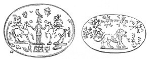 Principal face: In the center, the tauroctonous Mithra, with the dog, the scorpion, the two torchbearers, etc. Reverse: A lion with a bee in his mouth; above, seven stars surrounded by magic Greek inscriptions. (T. et M., p. 450.)