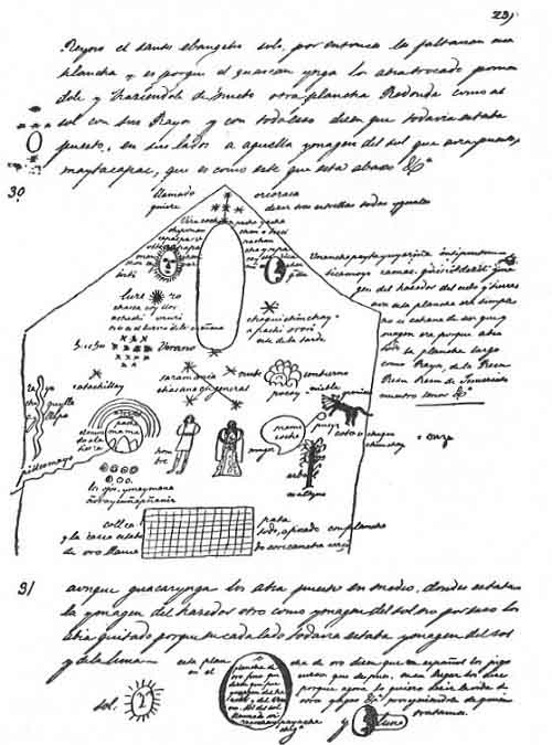 In his manuscript Salcamayha explains Coricancha, accompanying the text with another oval "creation" figure. A certain Ynca, he says, after he and his people had settled at Coricancha on whose site was reared the Temple of the Sun, "ordered the smiths to make a flat plate of fine gold, which signified that there was a Creator of Heaven and