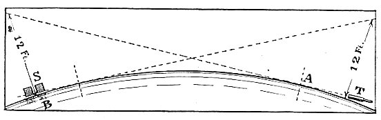 The result of the comparison of the conditions of observation with the accredited convexity is the same as in the case of the first target from the view under the bridge, with the instrument 6 inches above the water. The tops of the targets, if the water were convex, should have been 9 feet 10 inches below a direct line extending from the eye over the apex of the bulge to the terminus of the five miles. The accompanying diagram illustrates what would be the conditions and relations of the eye, the line of sight to the occulted objects, upon the basis of the calculated convexity. T represents the telescope, 6 inches from the surface; A, the apex, ¾ of a mile distant; S, the