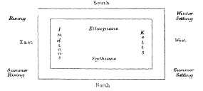 Extract from the fourth Book of the History of Ephorus.130 The Indians inhabit a country in the east near sunrise, while the Ethiopians dwell in the south near the Meridian, the Kelts in the west near sunset, and the |74 Scythians in the north towards the Pole. These divisions are not of equal size, Scythia and Ethiopia being larger and India and the Keltic divisions smaller. The two larger, however, are of similar size, and so are the two smaller. For the Indians are situated between the summer and the winter sunrise, while the Kelts occupy the regions from the summer to the winter sunset. The two distances are equal as well as nearly opposite each other. The Scythians again inhabit those regions which the sun leaves unvisited in the course of his revolution. They are situated opposite the nation of the Ethiopians, which seems to extend from the winter sunrise to the shortest sunset.
