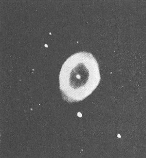 The ring or hollow shell nebula in Lyra was evolved from masses of nebulous matter, showing the polar opening and central sun, which will finally evolve itself into a new planet. |