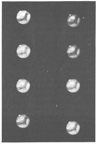 It is very interesting to read Lowell's account of these observations and to note how his observations all fit into one another and are accurate and how his explanations fail to account really for what he sees. In this same part of his book, "Mars", he speaks of a fellow observer, Mr. Douglass, who detected "rifts" in the cap--which sounds suspiciously as if this observer has seen clouds in the interior of the planet passing across the face of the polar opening. And Lowell adds, "On June 13 I noticed that behind the bright points the snow (he calls it) fell off shaded to this rift" which again sounds as if clouds were gathering near the bright spots. He continues: