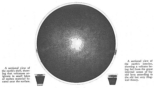 A sectional view of the earth's interior, showing a volcano being fed from the great internal ocean of liquid lava according to the old but very illogical theory. | |