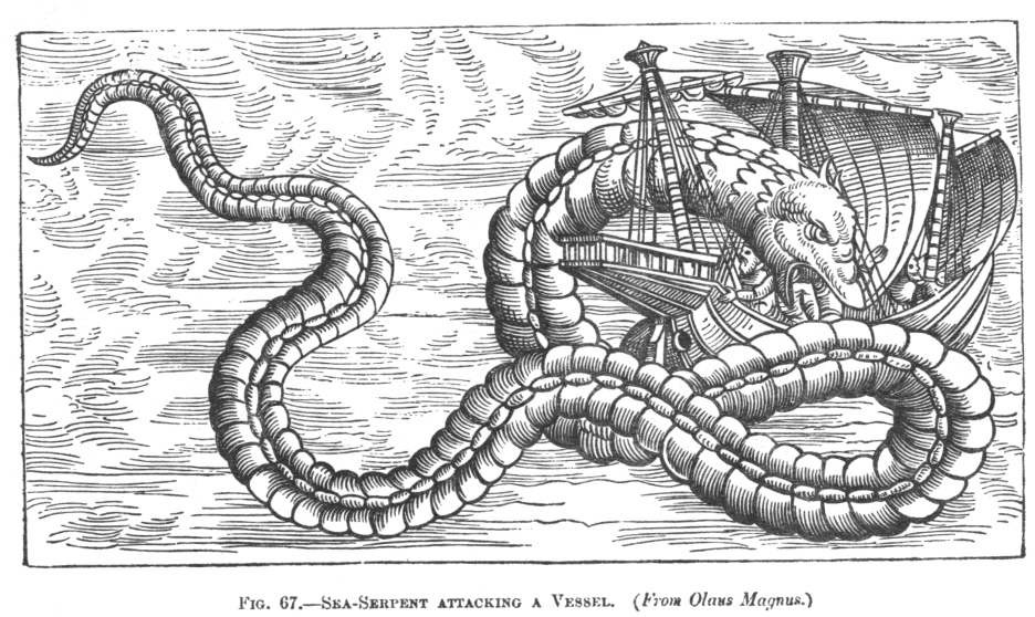 Aldrovandus, quoting Olaus Magnus, says that about Norway there occasionally appears a serpent reaching to one hundred or two hundred feet in length, dangerous to ships in calm weather, as it sometimes snatches a man from the ship. It is said that merchant ships are involved by it and sunk.