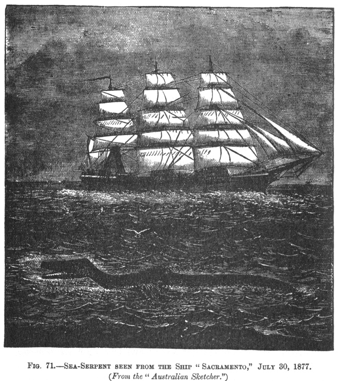 262:* "I fully believe in this great marine monster. I have as much evidence as to its existence as of anything not seen. Some years ago, Captain Austin Cooper and the officers and crew of the Carlisle Castle, on a voltage to Melbourne, saw the ' varmint.' A description and sketch of it were published in the Argus. This, when it arrived in London, it being the ' silly season' in journalism, was seized and torn to pieces by one of the young lions of the Daily Telegraph, in a leading article, in which much fun was poked at the gallant sailor. 'I don't see any more sea-serpents,' said my Irish friend to me. 'It is too much to be told that one of Green's commanders can't tell the difference between a piece of sea-weed and a live body in the water. If twenty serpents come on the starboard, all hands shall be ordered to look to port. No London penny-a-liner shall say again that Austin Cooper is a liar and a fool.' After this we softened down over some Coleraine whiskey. Again, some three years ago, the monster was plainly seen off the great reef of New Caledonia by Commandant Villeneuve, and the officers of the French man-of-war, the Seudre. Chassepots were procured to shoot it, but before it came within easy range it disappeared. During my late visit to Fiji, Major James Harding, who was an officer in Cakoban's army when that chief, 'by the grace of God' was king of Fiji, described exactly the same creature as passing within a few yards of his canoe on a clear moonlight night in the Bay of Suva. It swam towards a small island outside the reef, which is known amongst Fijians as the 'Cave of the Big Snake.' Major Harding is a cool, brave soldier, who saw much hot work with Cakoban's men against the hill tribes of Vonua Levu. He was once riddled by bullets, and left for dead. Accustomed for years to travel about the reefs in canoes, every phase of the aspect of the waters was known to him, and he was not likely to be frightened with false fire. The extraordinary thing is, that the English sailor, the French commander, and the Fijian soldier, all gave the same account of this monster. It is something with a head slightly raised out of the water, and with a sort of mane streaming behind it, whilst the back of a long body is seen underneath the water. So, from these instances, in which I know the witnesses, I fully believe in the sea-serpent. What is there very wonderful in it, after all? The whale is the largest living thing. Why shouldn't the waters produce snakes of gigantic size." THE VAGABOND, in Supplement to the Australasian, September 10, 1881.