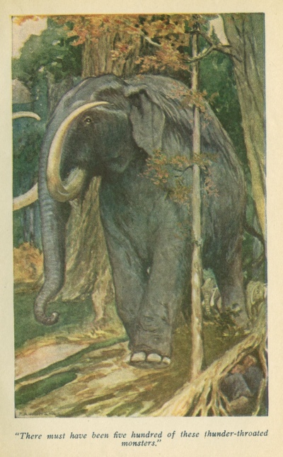 One day we saw a great herd of elephants. There must have been five hundred of these thunder-throated monsters, with their restlessly waving trunks. They were tearing huge boughs from the trees and trampling smaller growth into dust like so much hazel-brush. They would average over 100 feet in length and from 75 to 85 in height.