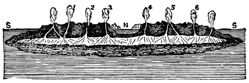 view, supposing it to be cut through the centre of its whole length, and the water in the front cleared away. N, the northern centre, S. S. the usual sea level, and the figures 1, 2, 3, 4, 5, 6, representing volcanic craters, or outlets of the great fiery gulph below.