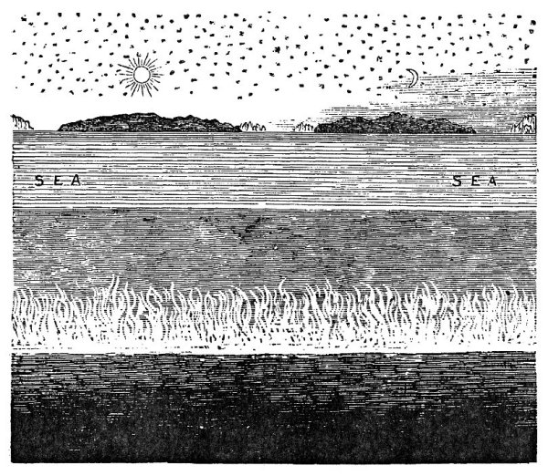 [paragraph continues] Where? Above, upon, within, and below, are all that can possibly exist; but since it is not above, nor upon, nor within, below only remains. Therefore it exists below the lowest depths of the great stratum of waters which constitute the "foundations of the earth." This terrible subaqueous world of fire, acting upon the under surface of the water, decomposes or separates its elements, fixing its oxygen, and liberating its hydrogen, which holding in solution sulphur and other elements, forming sulphuretted hydrogen, permeates the waters, and in many parts of the world escape into the atmosphere, thus rendering vast regions, otherwise fertile and agreeable, unfit for the habitation of man.