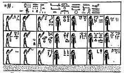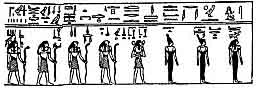 This scene is explained by the horizontal line of inscription written above it, and the hieroglyphic text, based on the editions of Lefébure and Champollion, reads:--