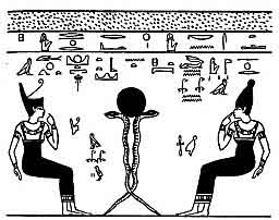 4. An axe, symbol of "god," standing on the handle end, with a disk resting on the side edge of the head. On the left is a goddess who is steadying the axe with her left hand, and on the right is a goddess who is steadying the disk with her right hand; the names of the goddesses are NETHETH, and KENAT, respectively. Each goddess is depicted in the act of sitting, but lacks a seat or throne. The text which refers to these scenes reads: "Of those who are in this picture [the two goddesses on] the left come forth from the double serpent MANENUI, and [the two] on the right come forth from the axe SETFIT. They gather together the souls on earth, and they make pure the mighty spirits in the Tuat by the hidden figures which are therein, and [afterwards] they swallow their own spirits (or, souls) after this great god hath passed them by."