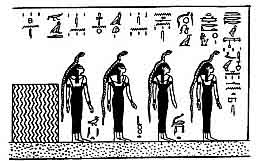 in their right hands, and a sceptre in their left; they face the ape god, whose tail is stiffened out under him in such a manner as to form a seat for him, and who holds the utchat, or eye of the sun, on his two hands. The first four of the goddesses have each the head of a lioness and are called:--