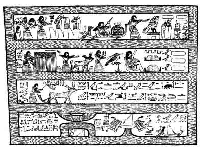 This Chapter is most important as showing that the deceased wished to have his homestead and its fields situated in Tattu that is to say, near the capital of the Busirite or IXth nome of Lower Egypt, a district not far from the city of Semennûd (i.e., Sebennytus) and lying a little to the south of the thirty-first parallel of latitude. It was here that the reconstitution of the dismembered body of Osiris took place, and it was here that the solemn ceremony of setting up the backbone of Osiris was performed each year. The original Sekhet-Aaru was evidently placed here, and we are therefore right in assuming that the fertile fields of this part of the Delta formed the prototype of the Elysian Fields of the Egyptian. At the same time he also wished to reap crops on the fields round about Heliopolis, the seat of the greatest and most ancient shrine of the Sun-god. The white grain of which he would have his bread made is the ordinary dhura, and the red grain is the red species of the same plant, which is not so common as the white. As keepers of the door of his estate the deceased asks for the "forms (or persons) of his father and his mother," and thus we see a desire on the part of the Egyptian to continue the family life which he began upon earth;