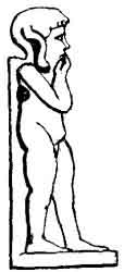 agreeing with that afterwards adopted by the Christians--namely, the Great God, the Son God, and the Spirit God. In Fig. 88, the ugly grotesque human body is that of the great Pthah, the hawk's wings are those of the child Horus, and the ram's head is that of Kneph, the Spirit. But the favourite character of Horus is that of the Son. Instead of being a crowned king, the avenger of his Fig. 88. father, he becomes a young man, or rather a child, with a finger on his mouth, as if he had not yet learned to talk, as in Fig. 89. He is sometimes seated, as a baby, within the leaves of a lotus flower representing the rising sun; and even while a baby, holds the sceptres of Osiris as judge of the (lead. Among the porcelain images, made to be worn as charms, and to be tied round the neck with a string, he is often a child in his mother's arms (see Fig. 90).