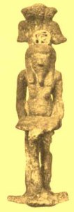 It is highly probable that Ah was the son of the great Mother deity Apet, who was identified with the female hippopotamus Taurt, "the mighty one", goddess of maternity, and "mother of the gods". At Thebes and Ombos, Osiris was regarded as the son of the sacred hippopotamus. As we have seen in the Introduction, he was, like Ah, identified with the moon spirit, which symbolized the male principle. The Apet hippopotamus was the animal incarnation of the Great Mother; as a water goddess, therefore, Apet links with Nut, who rose from the primordial deep and was "the waters above the firmament".
