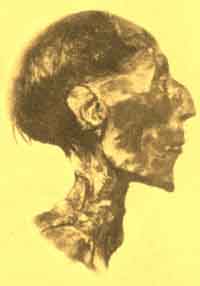 But although the name of' Rameses II dominates the Nile from Wady Halfa down to the Delta, we know now that there were greater Pharaohs than he, and, in fact, that he was a man of average ability. His mummy lies in the Cairo museum; he has a haughty aristocratic face and a high curved nose which suggests that he was partly of Hittite descent. He lived until he was nearly a century old. A worshipper of voluptuous Asiatic goddesses, he kept a crowded harem and boasted that he had a hundred sons and a large although uncertain number of daughters.