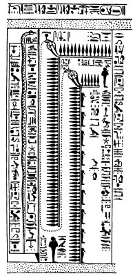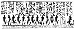 The Gods of the Fourth Division of the Tuat towing the Boat of Ra. The Nine Gods who follow Osiris. The Serpent Hereret and the Goddesses of the Hours.