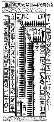 [paragraph continues] Ra, "RA-HERU-KHUTI unfoldeth our doors, and openeth our gateways. Hail, Ra, come thou to us, O great god, lord of hidden nature." The monster serpent which stands on his tail and guards the gateway is called TEKA-HRA, and the two lines of text which refer to his admission of Ra read:--"He who is over this door openeth to Ra. SA saith to TEKA-HRA:--'Open thy gate to Ra, unfold thy doors to KHUTI, that he may send light into the thick darkness, and may make his radiance illumine the hidden habitation.' This door is shut after the great god hath passed through it, and there is lamentation to those who are in this gateway when they hear this door close upon them." As the hieroglyphic text is identical with that given above on p. 120 it is not repeated here.