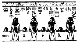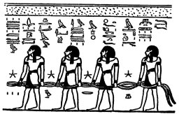 3. An upright, bearded mummied form called QAN. To the neck of this figure are attached two ropes, which are twisted together symmetrically, and are grasped by twelve bearded men with both hands. Each god stands within a loop formed by the two ropes, and has a star before him. The gods are described as "those who hold the rope which cometh forth . . . . . . . ."