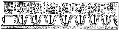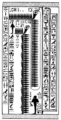 and belches fire into the face of their leader; the name of this serpent is KHETI, In each undulation stands a bearded god in mummied form, and the hieroglyphics written above describe them as "the gods who are above KHETI,"