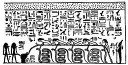 3. The undulating length of the serpent APEP, of whom it is said, "his voice goeth round the Tuat." Attached to the neck of the monster is a very long chain, which rises in an oval curve, and, passing along through the hands of sixteen male figures, is then grasped and held down by a large hand, from which it again rises in an oval curve, and passing on for some distance descends into the earth