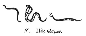 When they would represent the universe, they delineate a SERPENT bespeckled with variegated scales, devouring its own tail; by the scales intimating the stars in the universe. The animal is also extremely heavy, as is the earth, and extremely slippery, like the water: moreover, it every year puts off its old age with its skin, as in the universe the annual period effects a corresponding