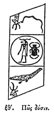 To denote sunset, they represent A CROCODILE TENDING DOWNWARDS, for this animal is self productive [?] and inclining downwards.